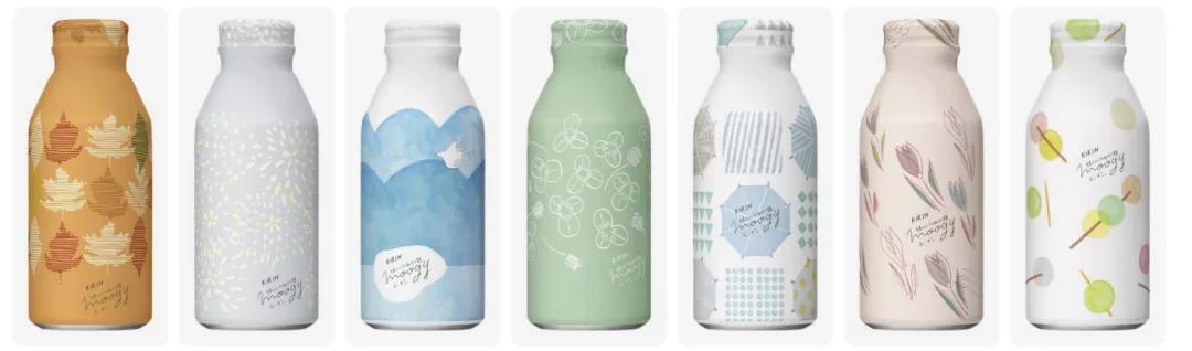 麒麟有一个专为女性设计的混合大麦茶系列"moogy",整个包装设计可爱满分。清新的配色和图案、手写体的文字、瓶身磨砂的质感,moogy的包装视觉上给人舒适的感觉。此外,moogy的包装每隔一段时间就会上新,但保持一致风格。