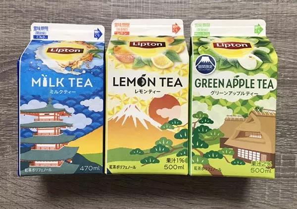 又比如在日本归属于森永乳业的立顿,在去年发布了一款限定包装,也成为了热议话题。青苹果茶、柠檬茶、奶茶三种纸盒的即饮茶,包装上分别是白川乡的合掌构造村落、富士山、五重塔三个景观的和风绘画。但是将三者并排放一起的时候,就会发现构成了一个完整的画。不仅让人感叹"斯国一(日语厉害的谐音)"。
