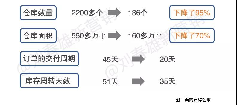 数据显示,在启动美的T+3项目变革后,美的在全国的仓库从2200多个减少到136个,仓库数量下降了95%;550多万平的仓库面积减少到了160多万平,整个仓库面积下降70%;订单的交付周期,也从原来的45天缩短到了20天,而行业整体周期为40余天;库存周转天数从51天到35天。在库存大幅下降的同时,仓库效率大幅提升。