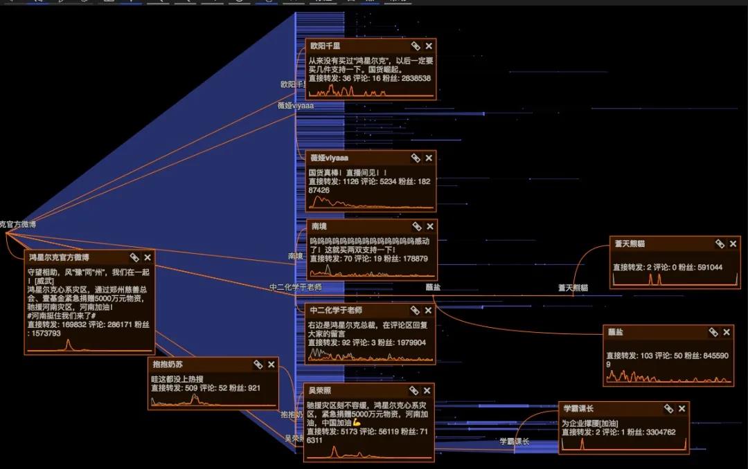 根据微博大数据中心对鸿星尔克的传播路径来看,以"鸿星尔克官微+董事长吴荣照"的企业组合发声下,网友不断的参与进来,从粉丝只有921的普通网民,到十万、百万到千万级的薇娅,最终完全爆发,从微博破圈到其他平台。