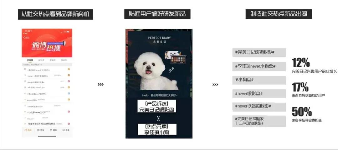 通过微博热点组合的方式进行传播,#小狗盘#成功出圈,兴趣用户增长12%。而这些新增用户中有50%来自李佳琦的官微粉丝。