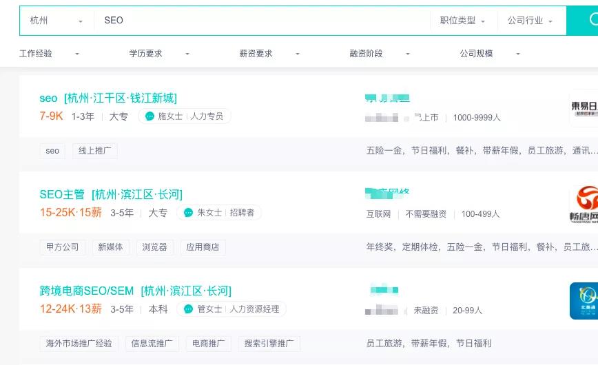 其实,关于SEO还有没有前途一直有人在问,我之前写过,末尾相关推荐。那么关于SEO从业待遇如何呢?我们先随机看看几个招聘平台关于SEO工资待遇哈,如图: