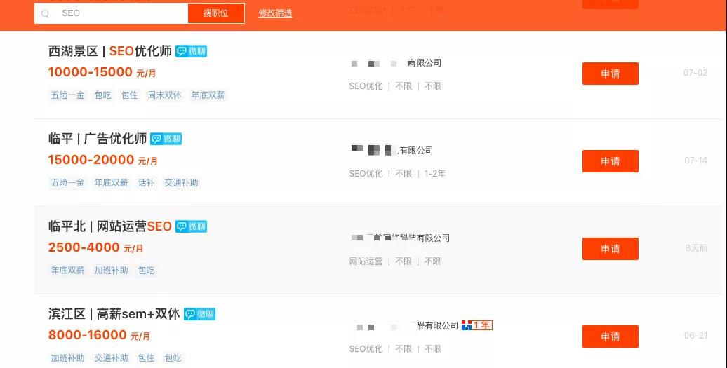 因为白杨SEO坐标杭州,我选的招聘平台截图分别猎聘、拉勾、智联、BOSS、58同城,最低是2500,最高是20000,至于-后面这个数字,看看即可,哈哈哈。