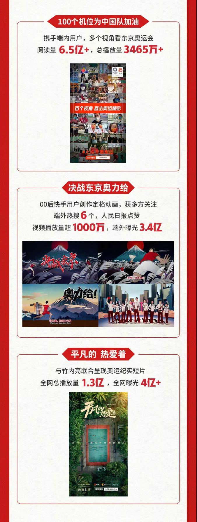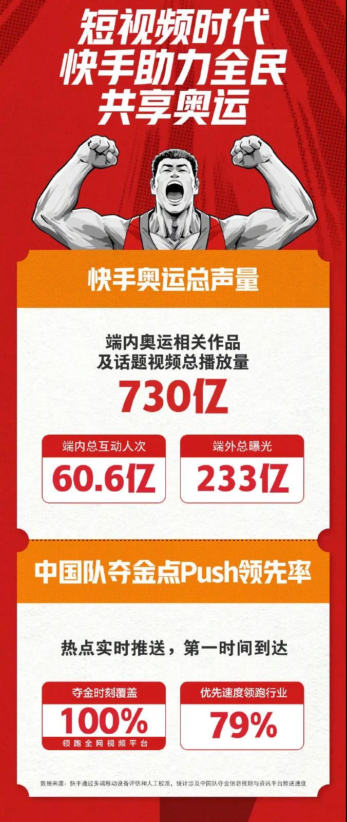 截至8月8日,快手平台奥运相关内容及话题视频总播放量达730亿,端内总互动人次突破60亿,奥运赛事点播总播放55.9亿。奥运夺金时刻推送覆盖率超过100%,领跑全网视频平台。
