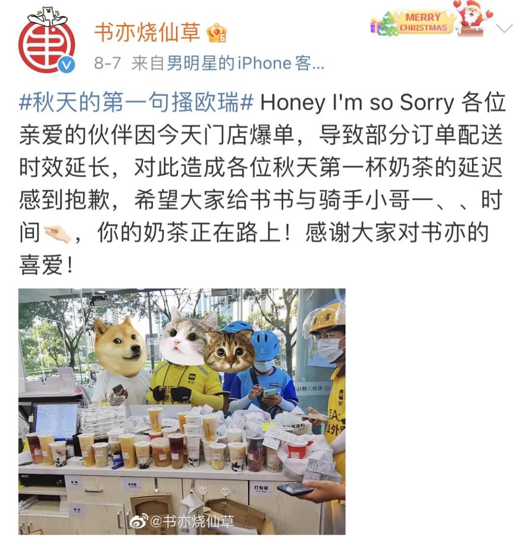 如书亦烧仙草就表示,#秋天的第一句骚瑞欧#,因为店铺爆单,导致部分订单配送时效延长,而表示抱歉。
