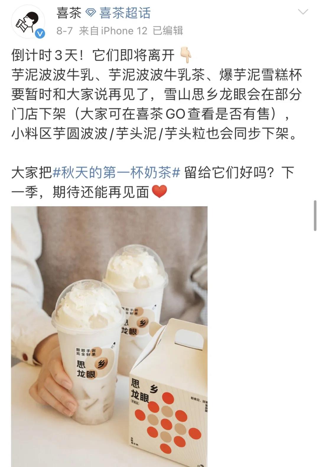 而喜茶为了推销即将下架的单品,营造稍纵即逝的稀缺感,在自己的官方微博上表示,大家把#秋天的第一杯奶茶#留给它们好吗?