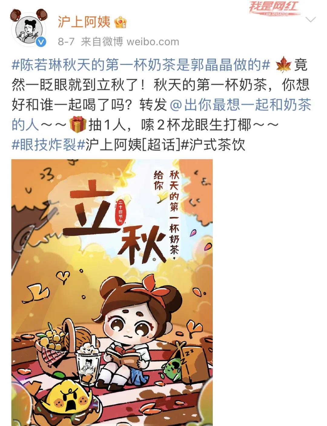 沪上阿姨除了带上了关键字"秋天的第一杯奶茶",并附上了另一个热搜话题#陈若琳秋天的第一杯奶茶是郭晶晶做的#,去引发用户的注意,并乘机推出了品牌的活动。