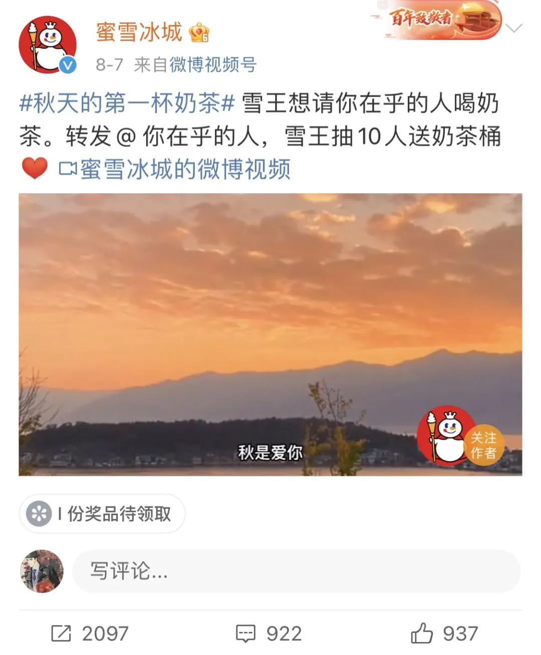 蜜雪冰城则拍摄了一条视频,呼吁网友请自己在乎的人喝奶茶,并在视频向自己的用户表白,让大家一起在这个秋天感受甜蜜蜜。