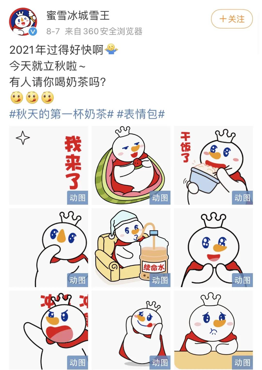 同时,蜜雪冰城还推出了「秋天的第一杯奶茶」的表情包,憨态可掬,萌萌哒,想要与用户玩在一起。