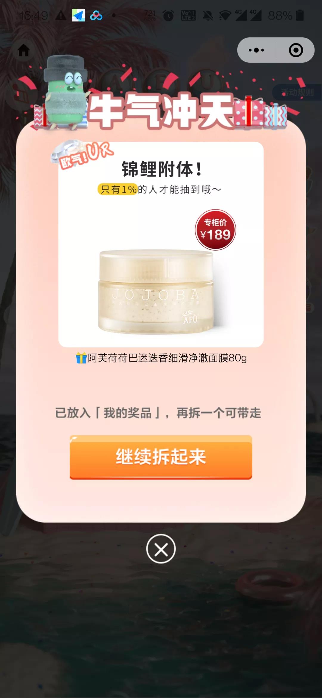 在抽奖时阿芙大量用到了1%、千分之一、万分之一、锦鲤大奖等词汇,让人感觉自己非常幸运,从而加大产品价值感,让用户更容易付费。