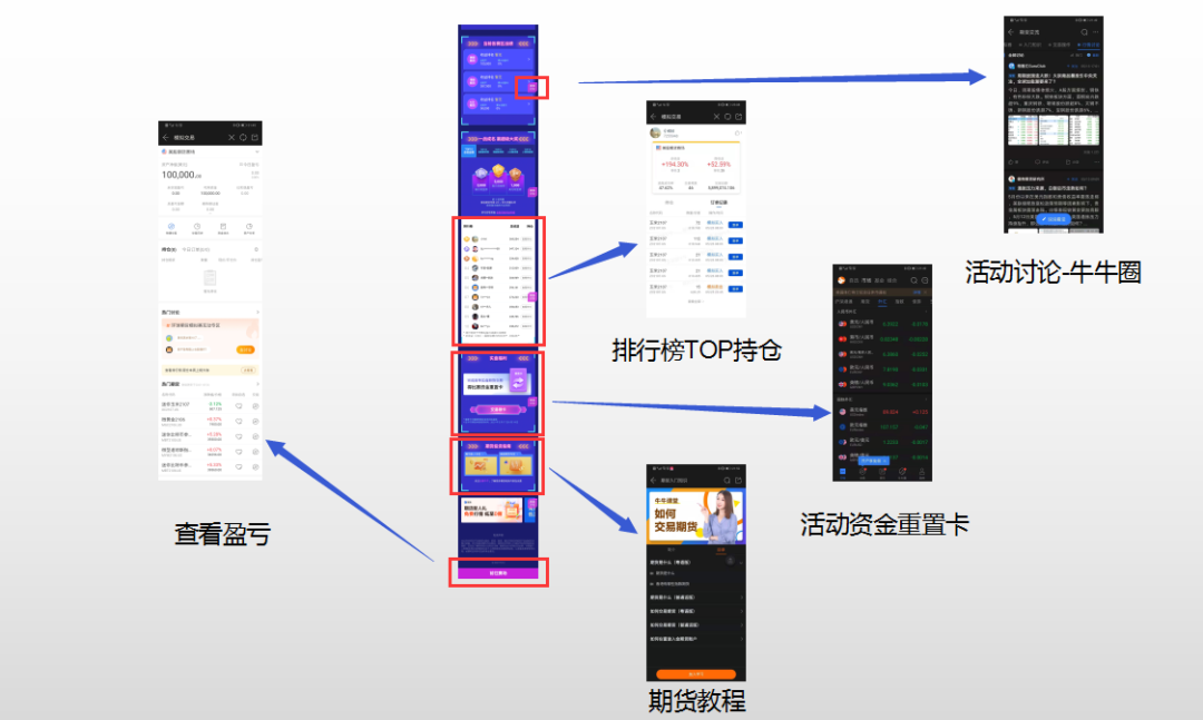 活动主页第一屏显示个人账号的持仓和收益,在主页的第二屏就能看到排行榜前十的奖励、名单,与广告强相关,保证用户不会在这个环节出现大量流失。