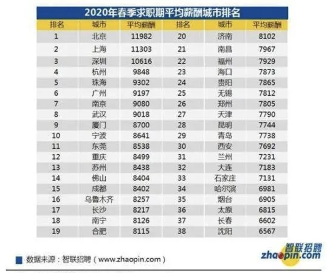 以下是智联招聘2020年春季求职期平均薪酬城市排名: