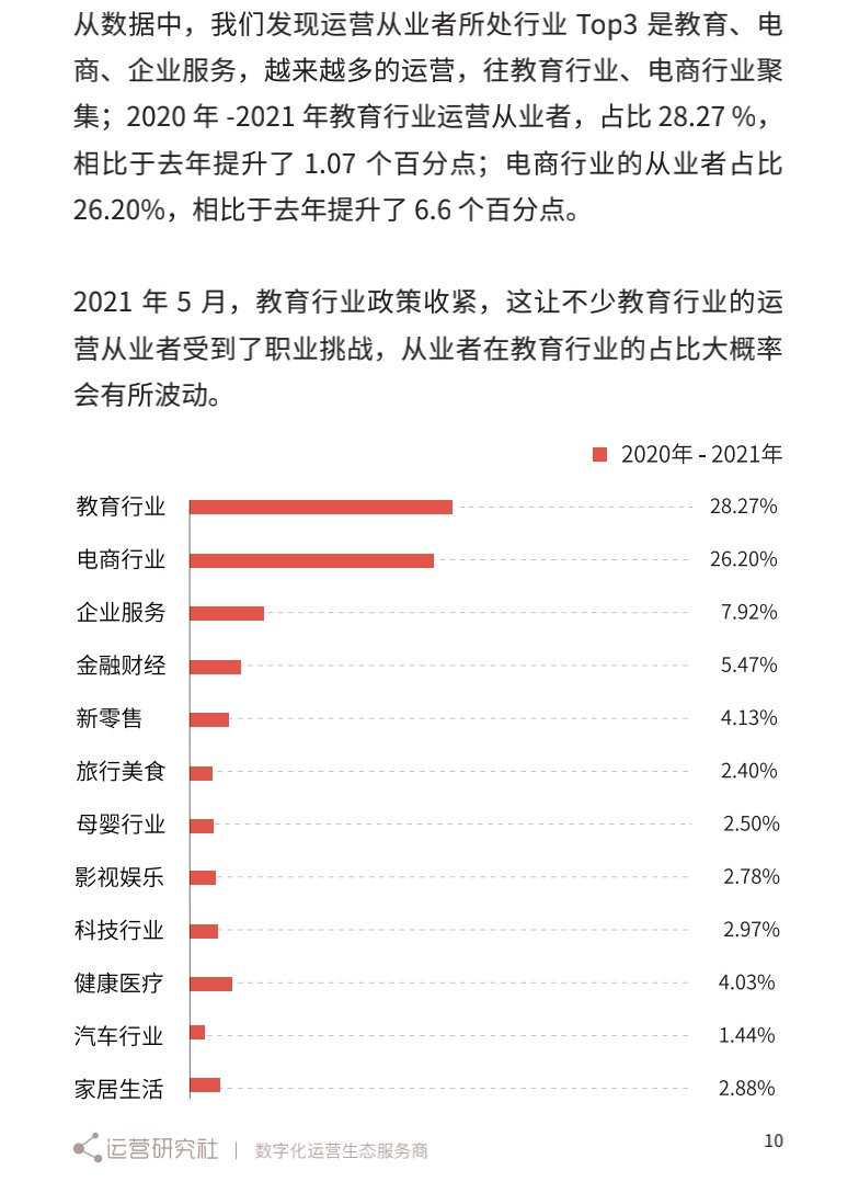 以下是运营研究社2020-2021年运营人薪资&职业现状调查白皮书的相关报告,这是其中运营人行业分布情况: