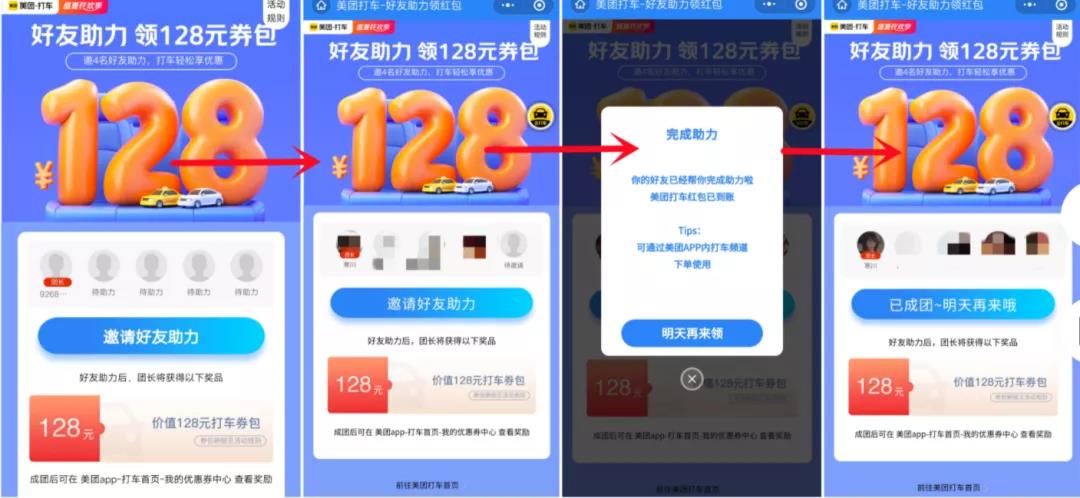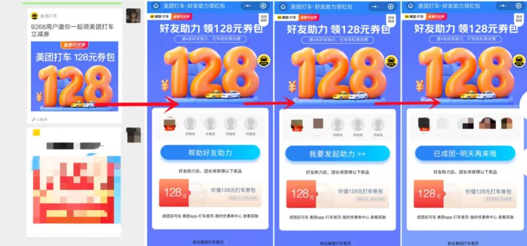 今天分享的案例来自河林童鞋,所拆解的【美团打车】好友助力领128元券包活动~