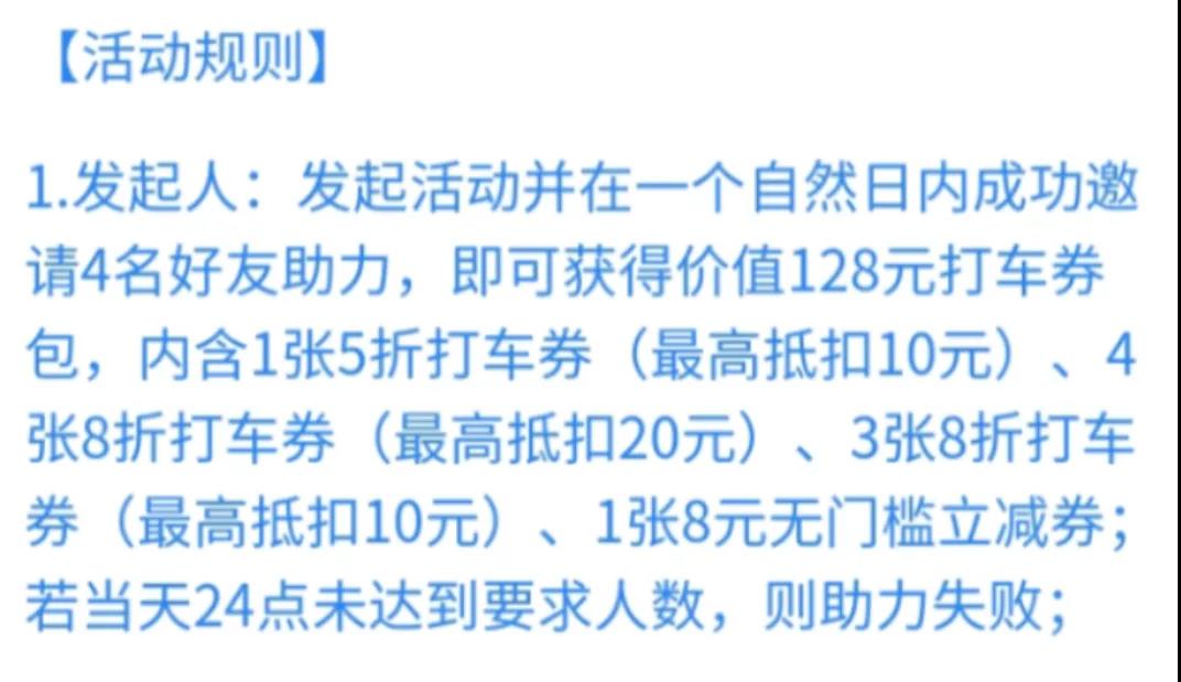 此处"参与助力可获得",没有注明前提条件是否有助力需要成功;如果不论助力成功与否,只要参与助力就可以获得打车券,则应该在规则注明,这属于一个对用户有好处的利益点;
