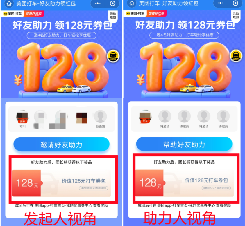 二是因为美团打车同时推出了另一个邀请助力,下单后可以获得优惠的活动,这个活动针对的则是促进转化;