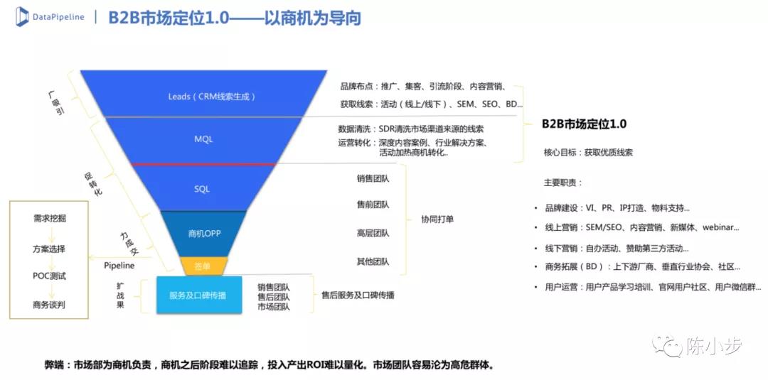 以图中的红线为界,市场主要负责商机的前半段,市场验证通过线索(MQL)转给销售后,后续的商机到签单以销售为第一责任人,与市场部的关联度相对降低。