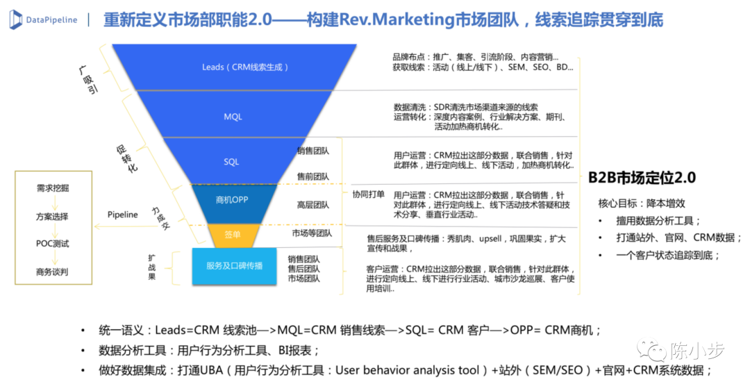 只有在这个共识之下,Marketing从全局组织发展及结合企业当前情况考虑,建立一套从Leads—>签单的全线索生命周期管理,保障线索价值最大化,进而保障企业利益最大化,以及和销售配合真正做到舒适的紧密协同。