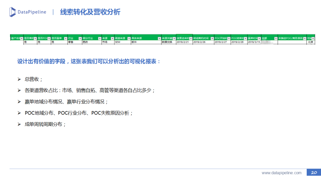以及在实际分析过程中,逐步设计出有价值的字段,然后固化到CRM流程里,以便更好的分析相关数据。下面这张图显示的这些字段,我们可以分析出的可视化报表有: