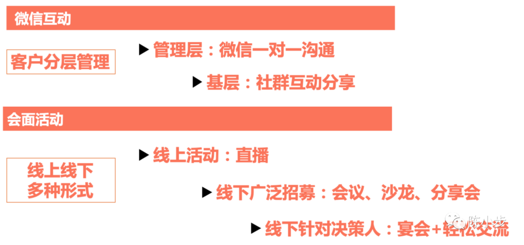 举个例子,我们银行核心的群体是12家股份制和134家城商行以及农商银行,目标的用户画像是 IT系统的信息科技处的处长/经理/技术专家,总共不到400余人,然后对目标客户进行穷尽,销售会提交在接触的人,我们帮他提供了一些渠道,优先去通过市场跟金融行业的一些俱乐部,或者说官方媒介去合作,然后把这些销售想联系,但是发现约起来比较难的对象,我们市场做分享活动给约出来,通过比如晚宴形式,10多个人,请专家讲趋势,讲金融行业数字化转型,金融科技变化等。然后请我们的老客户用轻松方式讲讲案例,这种方式其实也还不错。