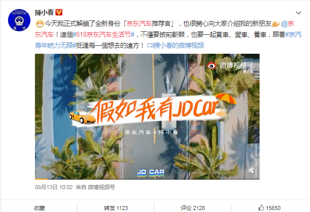 为了进一步打破行业壁垒,撕开了新的流量突破口,京东汽车还特别签约节目中频上热搜的陈小春为"京东汽车推荐官",一同打造了MV《假如我有JD car》在微信、资讯平台扩散,并在微博端打造#818京东汽车生活节#及#818京汽青年燃力无限#话题搅动网友讨论,推动了这次活动在全网的刷屏曝光。
