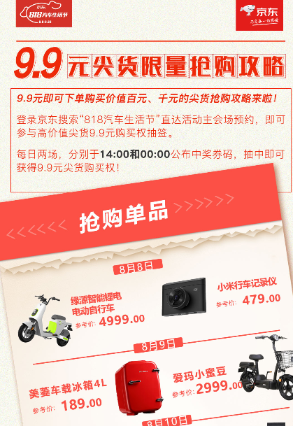 在8月8日-8月20日期间,从参考价18000元的威固车衣、到价格几千元的电动自行车,再到几百元的小米行车记录仪,京东汽车每天都推出了不同的爆款尖货限量9.9元抢购,以及汽车全品类满200打九折最高减400元的福利;