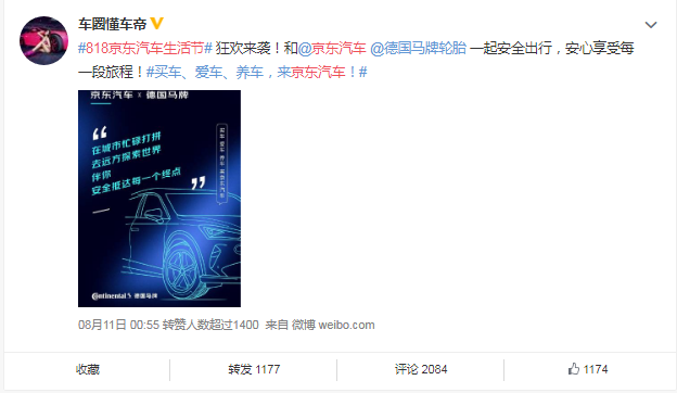 在这次"818京东汽车生活节"的传播中,京东汽车也积极以消费者的兴趣为抓手,在社交平台打造多元内容,借助汽车、娱乐多个圈层KOL从年轻人的喜好出发进行种草,打造从内容主导变成泛娱乐内容到营销转化的链条式路径传播。不仅实现了流量的再突破,京东汽车也在这一过程中实现了从内容到引流、转化的全链路闭环。
