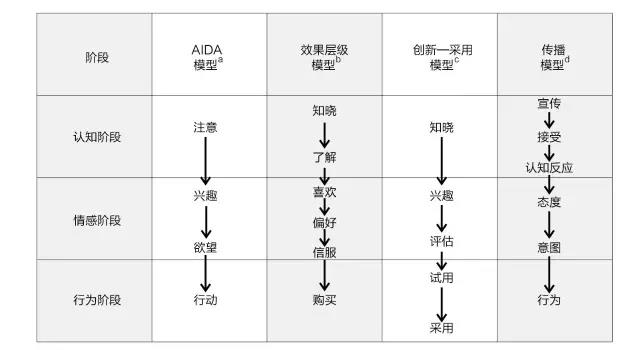 其中最为人熟知的就是AIDA模型,即注意兴趣欲望行动,在传统的营销中使用很多。