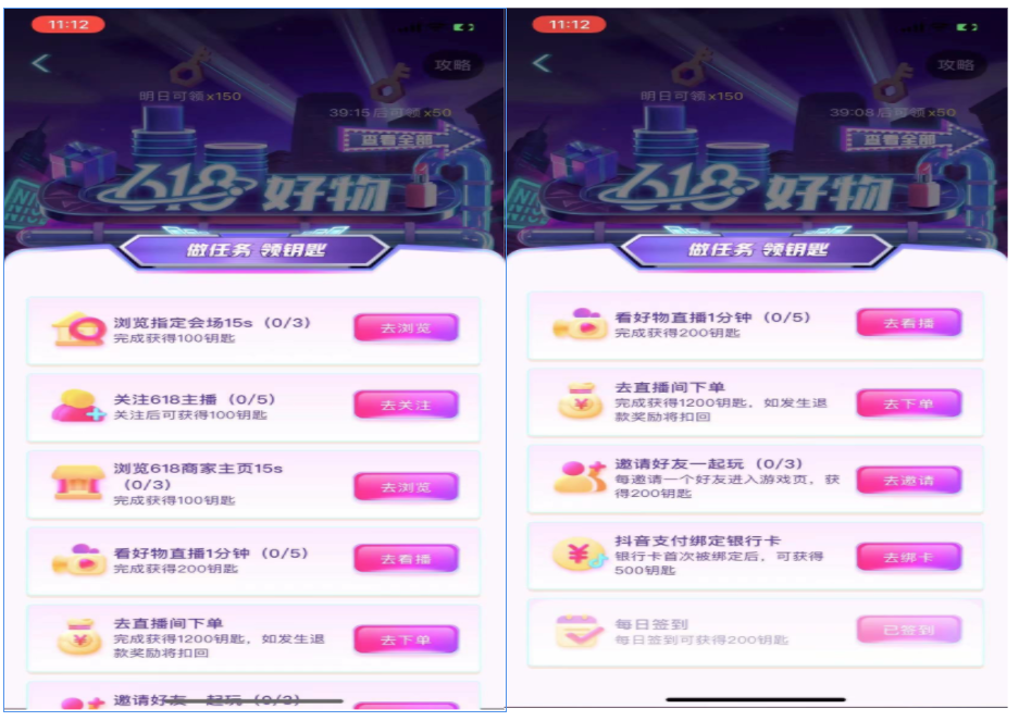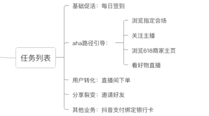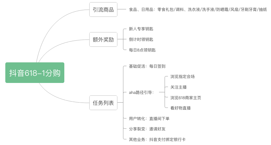 核心目标是通过引流品,拉动用户活跃参与618购物,并借助任务设置同时进行拉新、转化,把抖音商城推广出去,培养用户直播购物的习惯,提高618的成交率。