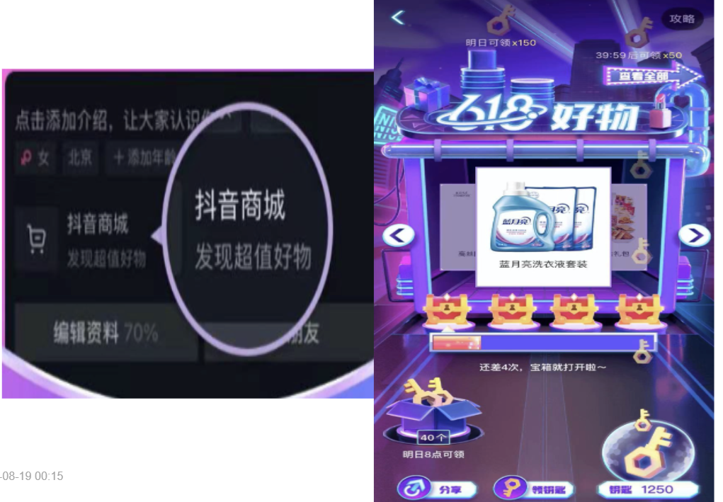 此外还有额外获得钥匙的途径如倒计时x分钟可以领取(目的是提高用户离开的成本让用户沉浸)