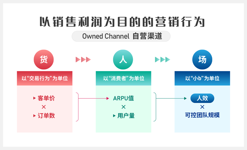 Owned Channel(自营渠道),这个概念应该划分到「渠道营销」的范畴,为企业解决「卖出去」的问题。是千百年来所有生意的目的和意义——达成交易获得盈利。通过提升人与货的匹配交易效率,增加营业额,创造利润。其交易与交互的数据亦可沉淀至Owned Panel成为消费者洞察的重要组成部分。