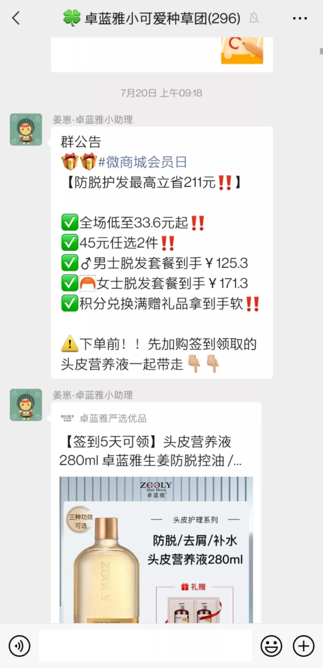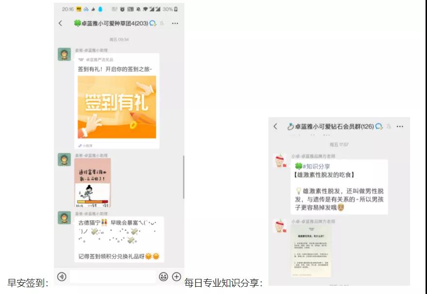 想要持续保持高活跃除非客户属于因为喜欢这个领域而进入,否则就需要一定的外在触发,让成员知道这个群,而卓蓝雅的每日群消息就是外在触发