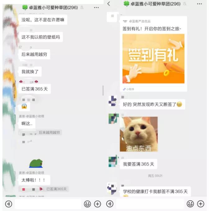 因为积分体系做的比较好,他们签到效果/效率非常高。客户可以为了积分连续签到365天,且每天都有客户主动将积分签到发到群内,社群一连活跃几年(后面会说客户为何会如此疯狂签到)