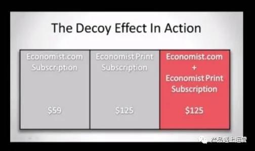 我们看到,选项2自身虽然似乎没有意义,无人选择,但它却作为"心理锚点",改变了用户的比较的注意力,把针对要不要为印刷版多付66美元的比较,改变为对2和3进行比较,在"3很合算"的爽感驱动下,非理性地选择了选项3。