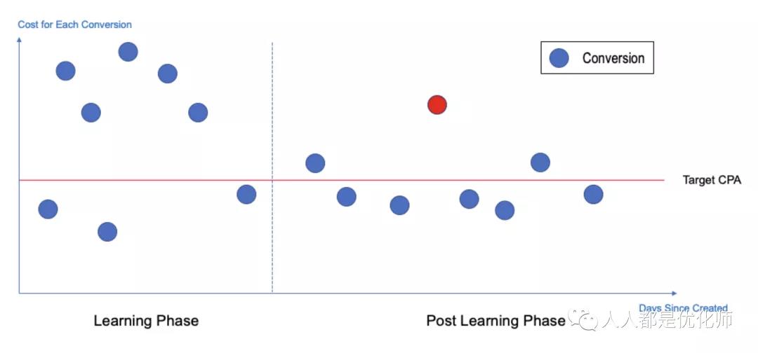 如图所示,度过学习阶段后成本波动较小。但是由于竞价的竞争性,转化费用会偶尔超过预期(如红点)。