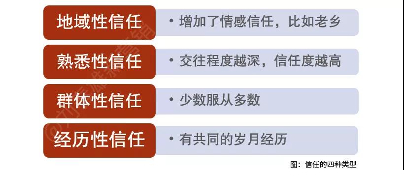 关系的核心是建立信任,一般有四种类型:1、地域性信任,比如老乡,感觉增加了情感信任。2、熟悉性信任,交往程度越深,信任度越高。3、群体性信任,大多数都信任了,少数服从多数。4、经历性信任,比如同学战友,有共同的岁月经历。