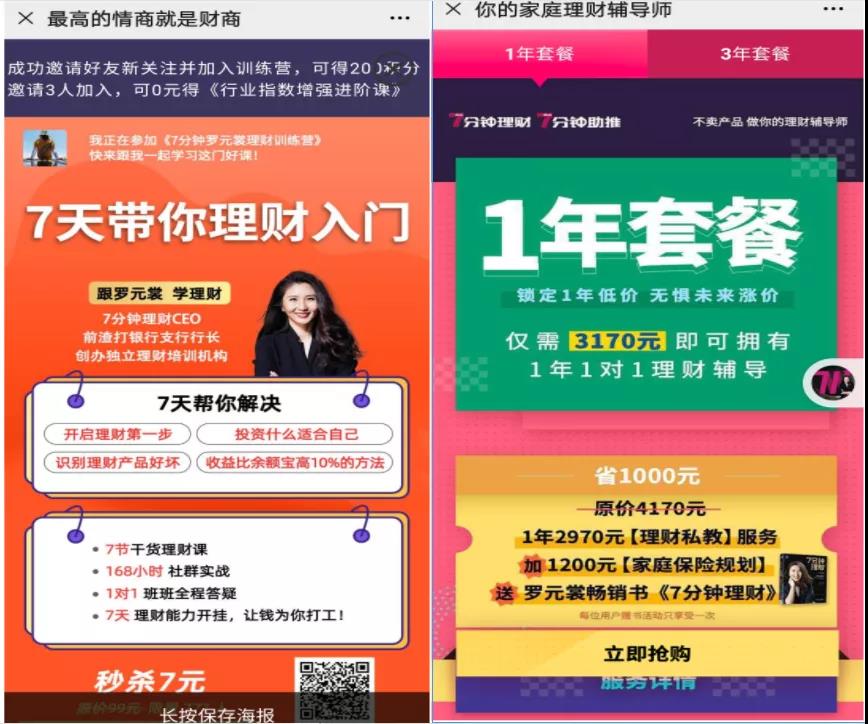 有一点类似简七这种女性理财导师形象的模式,只不过简七卖高价课程和会员体系,7分钟理财借创始人IP卖更高客单价的包年理财私教。