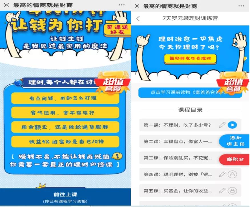 目前报名参加了他们的7天理财训练营,从加入的课程群情况来看,初步感觉用户群不是像长投小白课程那样的初级学员,而且其中已经有部分人群有过基金投资的经历,当然基础概念可能不太清楚。