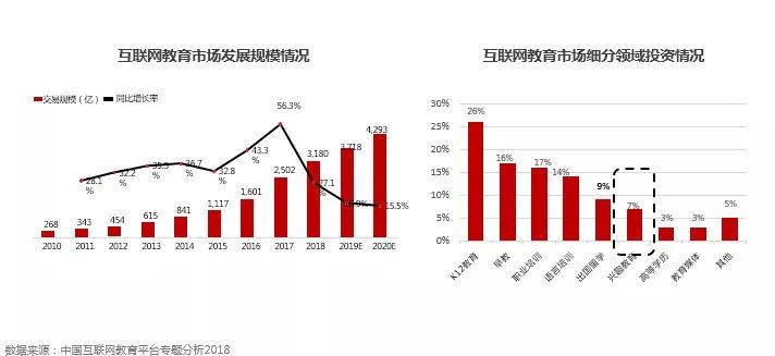 2018年, 中国互联网教育市场规模达到3718亿元人民币,同比增长27.1%,其中,兴趣教育行业占互联网教育市场份额较少,增长潜力较大。