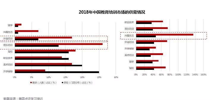 音乐、外语、兴趣等领域的需求大于供给,市场可拓性强,市场机会也相对较多,但从市场的更替来看,目前兴趣生活、驾校、外语培训的市场淘汰率相对较高,其中兴趣生活的替换率最高。