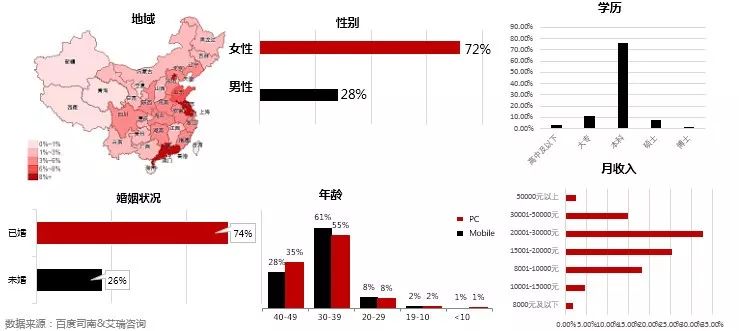 目标人群主要分布在中部、东部一二线\发达城市为主;已婚占比74%,女性人群占比较高,近72%;年龄层以30岁-49岁为主,本科以上学历占比85.5%,家庭月收入一万以上占比93.8%。