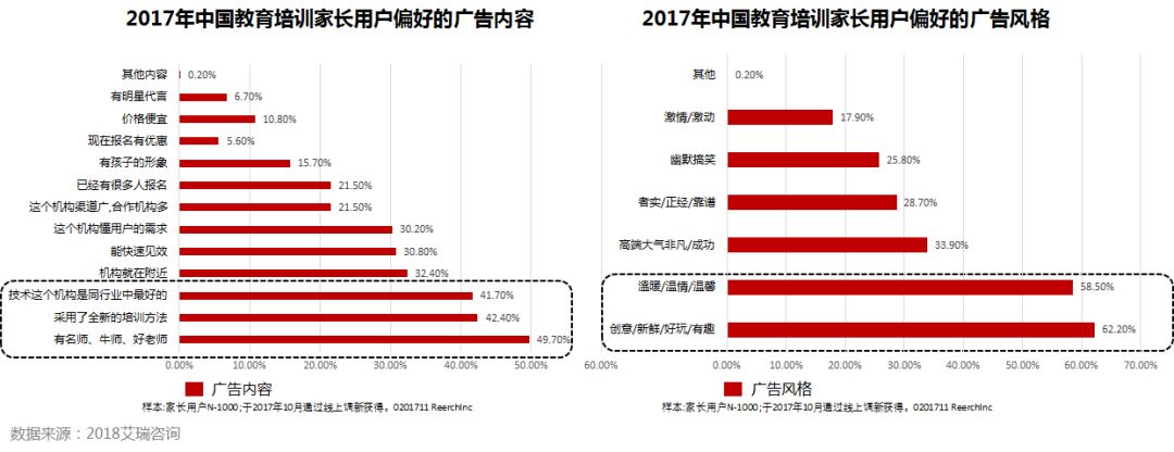 目标人群最(不)感兴趣的三类广告,最感兴趣:“有名师、牛师、好老师”,“采用了全新的培训方法或技术”和“这个机构是同行业中最好的”;最不感兴趣:“有明星代言”、“价格便宜”和“现在报名有优惠”;62.2%的家长会对新鲜好玩的广告感兴趣;教育培训机构可以尝试内容靠谱、风格又有趣的广告。