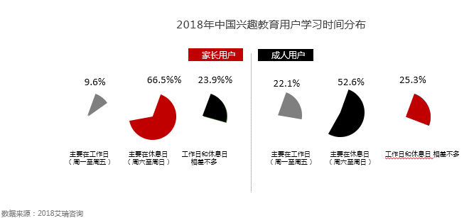 休息日是家长用户和成人用户共同的集中学习时间段;家长用户为孩子购买的学习培训产品/服务多集中在休息日(周六至周日),占比为66.5%;休息日是家长用户和成人用户共同的集中学习时间段。