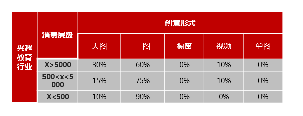 兴趣教育客户创意形式中,三图占主导地位,大图次之,视频和单图占比较低