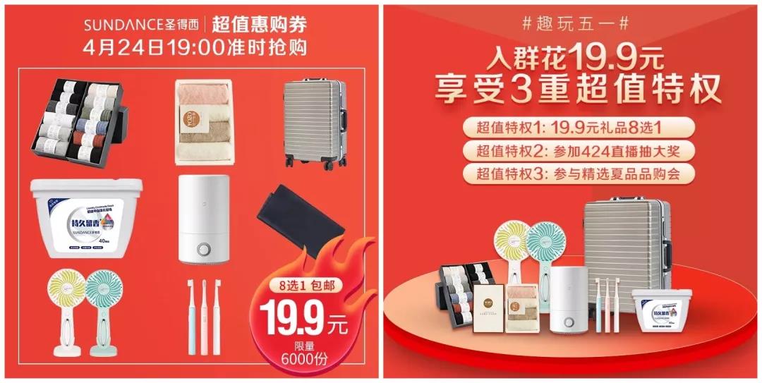 此外特权卡还附带了额外的双重福利:可以参加4.24直播抽奖的特权(引导观 看直播);可以参加品牌内购会享优惠的特权(引导消费下单)。