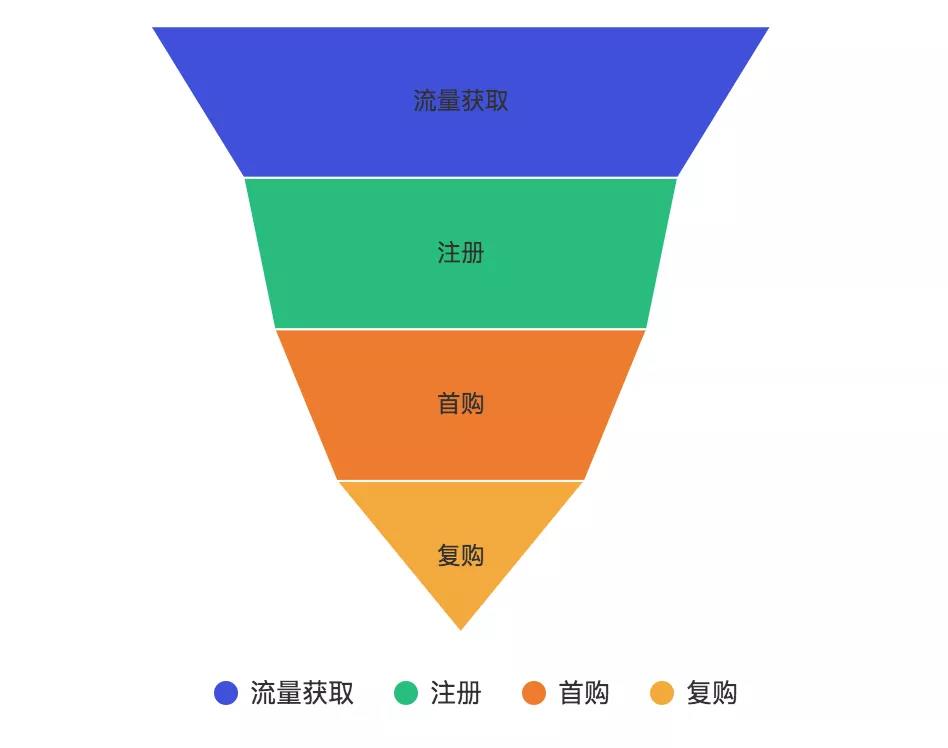 用户漏斗模型一般用来看全盘,从流量获取、到注册、到首购、到复购,流量是不断衰减的,在每一层都可能出现不同的问题。