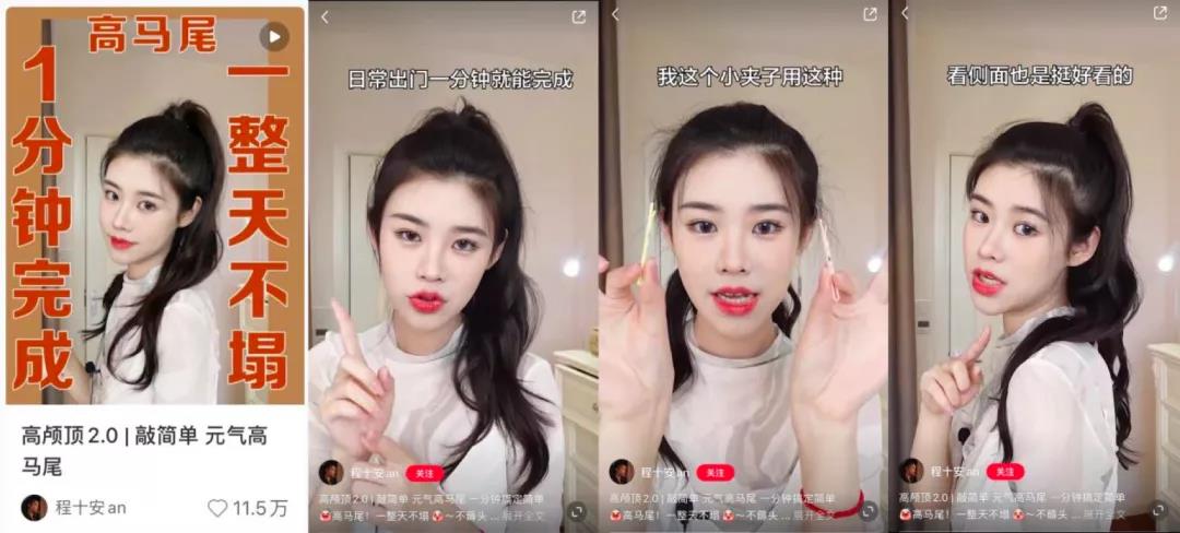 在打开视频之前,这篇笔记的亮点,是封面上的标题"高马尾,1分钟完成,一整天不塌",这是令很多喜欢扎高马尾女生心动的关键。