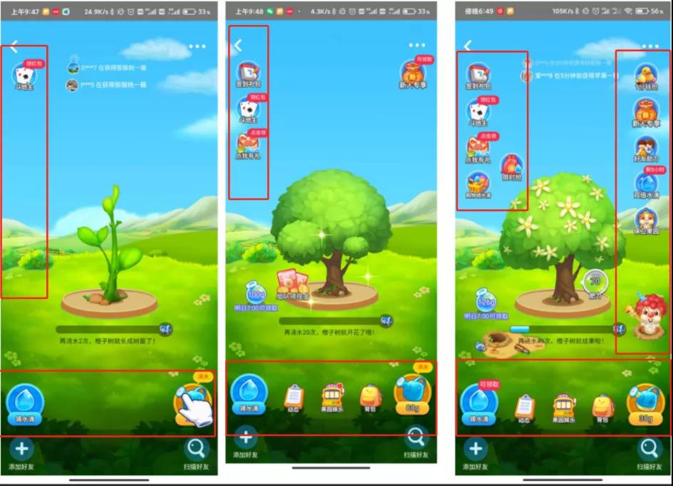 归类展示不同功能,比如:获取水滴、放松小游戏、好友列表等等