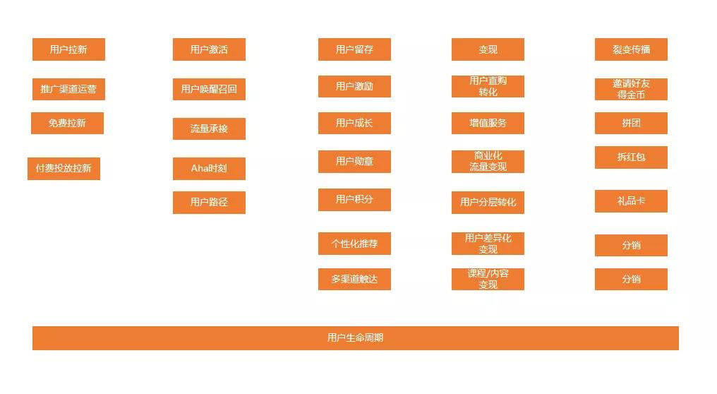 产品运营,采用产品化的运营策略来实现对于用户的干预,这个更多的是和前面2个版块结合共同使用。
