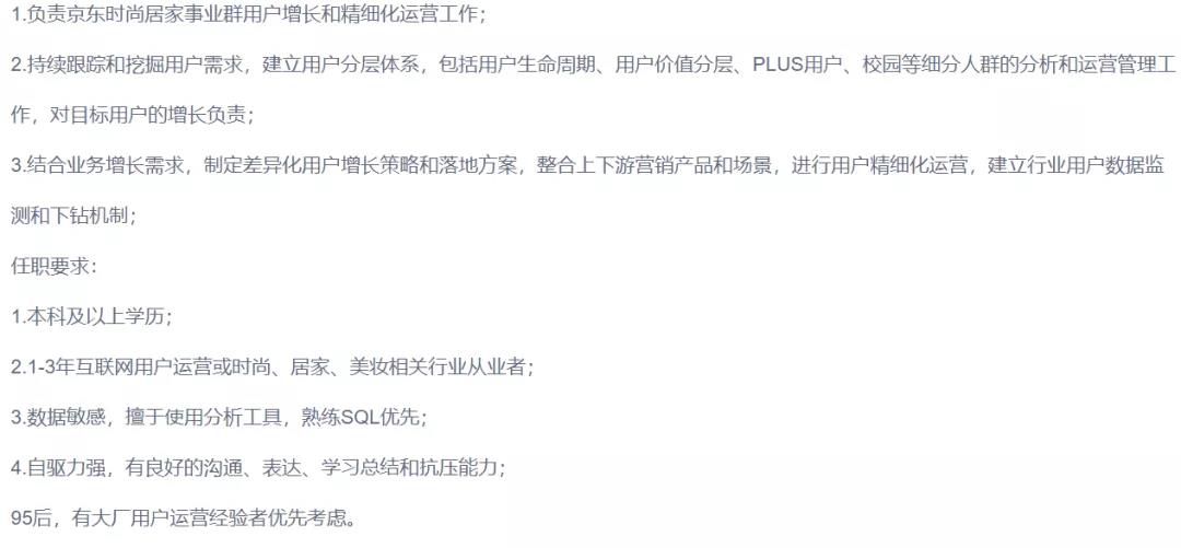 比如,我截图的几个岗位的关键词就是:精细化运营、生命周期、用户分层、用户转化、用户激励,用户分层,精细化运营,营销活动运营等。